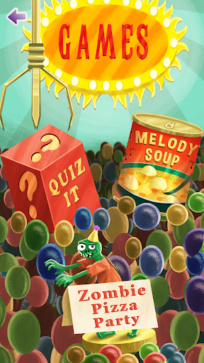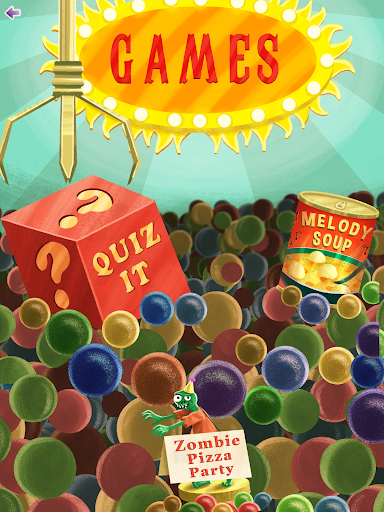 • Games: 2-3 games to reinforce key concepts in game-style play. Games are called “Melody Soup,” “Zombie Pizza Party,” and “Quiz It.”