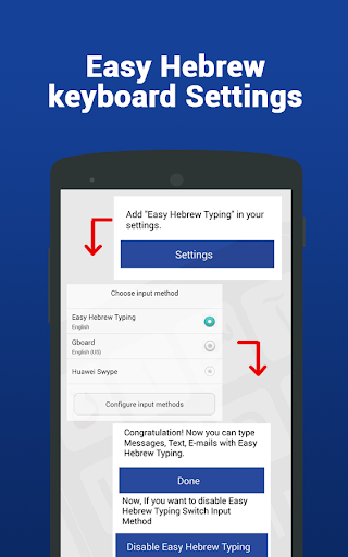 بعد تثبيت لوحة المفاتيح العبرية لنظام Android، فأنت حر في الاستخدام عن طريق الضغط على "تمكين لوحة المفاتيح" واختر لوحة المفاتيح هذه. تعمل لوحة المفاتيح هذه كوحة مفاتيح افتراضية في هواتف Android / أقراص للكتابة / الرسائل النصية. فقط اكتب اللغة الإنجليزية واضغط على مفتاح SpaceBar سيتم تحويل كلمتك الإنجليزية إلى البرنامج النصي العبري تلقائيا.