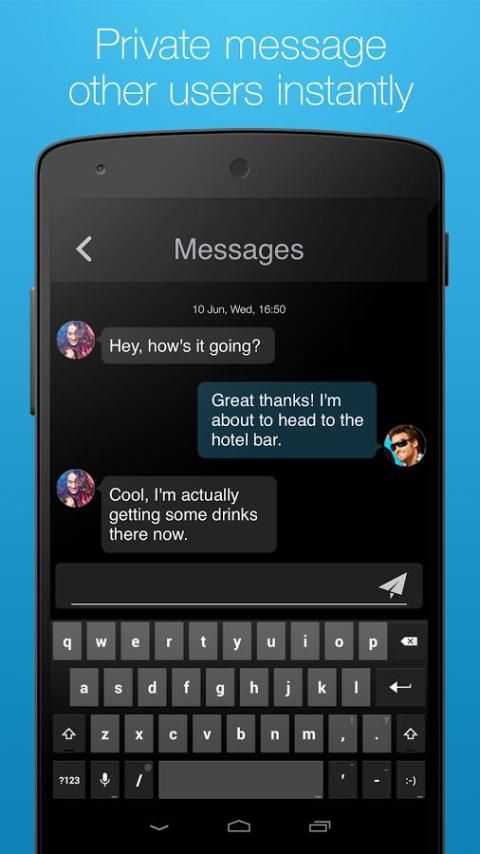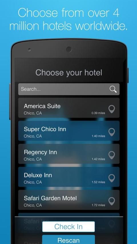 إنشاء ملف تعريف مع لمسة واحدة بسيطة باستخدام الفيسبوك أو ينكدين. سيكون لدينا التطبيق تلقائيا بدء المسح الضوئي للفنادق المحلية وأماكن للتحقق في قرب جهازك. تلبية أمثالهم، تكوين صداقات جديدة والتواصل مع رجال الأعمال الآخرين.