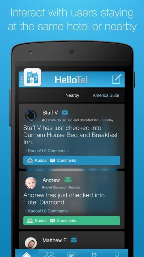 اكتشاف ما يحدث في الفندق أو في مكان قريب في بيئة اجتماعية المتخصصة. فتح شبكة اجتماعية الفنادق وتكوين صداقات جديدة، والتواصل مع رجال الأعمال الآخرين أو نطلب من المجتمع لالاستعراضات على الشركات المحلية.
