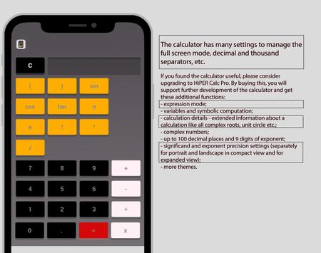 The calculator has many settings to manage the full screen mode, decimal and thousand separators, etc.