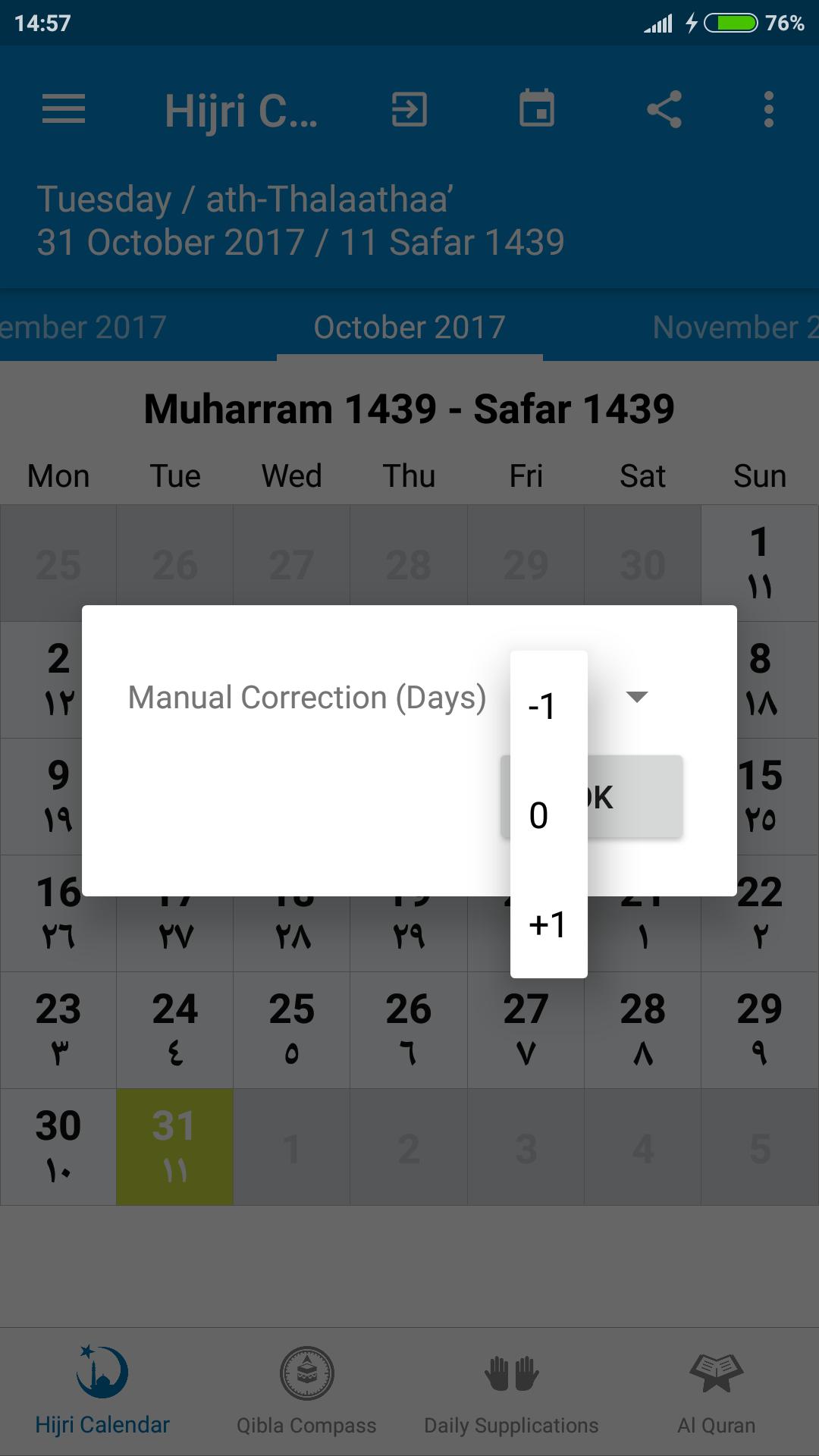- Hijri calendar correction setting allows you to correct hijri dates.