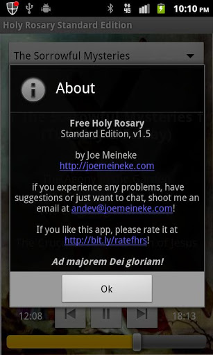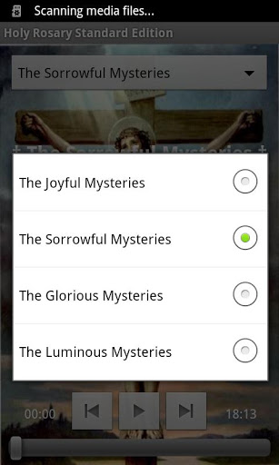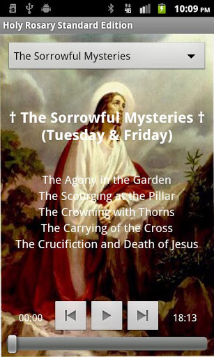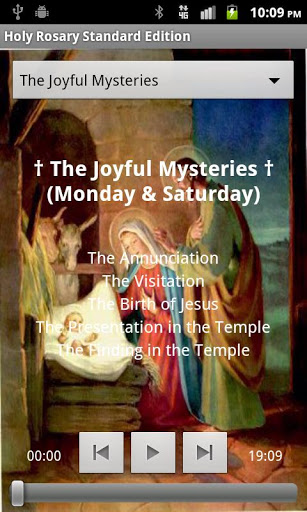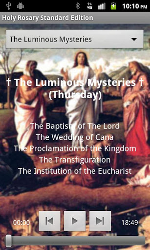 The appropriate mystery is loaded for that particular day when the application launches, or you can manually choose which mysteries you would like to pray along with.