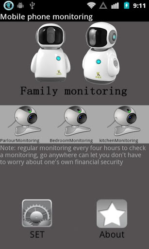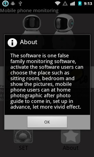 ***PLEASE READ BEFORE YOU DOWNLOAD**********Just fool your friends with this fake app for entertainment! Notification ads and icon ads in this free app help us to produce more free applications.********************************************Worried about your financial security in your family? Or do you want to check your family wherever you go? This free application Home Web Camera Monitor can monitor your home for free here with your Android mobiles or tablets.Instructions:The software is one false family monitoring software, activate the software users can choose the place such as sitting room, bedroom and show the pictures, mobile phone users can at home photographic after photo guide to come in, set up in advance, let more vivid effect.Regular monitoring every four hours to check a monitoring, go anywhere can let you don¡¯t have to worry about one¡¯s own financial security.We could import picture into category of parlor, kitchen or bedroom.webcam can be also used as security cameras Software is available to allow PC-connected cameras to watch for movement and sound, recording both when they are detected. These recordings then are saved to the computer, e-mailed, or uploaded to the Internet. In one well-publicized case, computer e-mailed images of the burglar during the theft of the computer, enabling the owner to give police a clear picture of the burglar's face even after the computer had been stolen.Recently webcam privacy software had been introduced by such companies such as Stop Being Watched or Webcam lock The software exposes access to a webcam and prompts the user to allow or deny access by showing what program is trying to access the webcam. Allowing the user to accept a trusted program the user recognizes or terminate the attempt immediately. Other companies on the market manufacture and sell sliding lens may cover that allow users to retrofit the computer and close access to the camera lens.