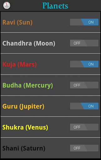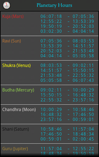 The app also enables the user to turn on/off other horas (Ravi - Sun, Chandra - Moon, Kuja - Mars, Guru - Jupiter, Shani - Saturn, Shukra - Venus, Budha - Mercury) during the day as required. Precise time of these horas can be access by sliding your finger down on the screen.