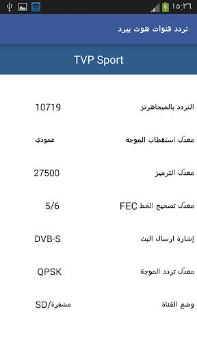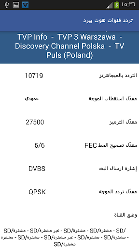 • معلومات تفصيلية لكل قناة (تردد - الاستقطاب - SR -FEC -Modulation -System - القناة (SD أو HD / مشفرة أو واضح))