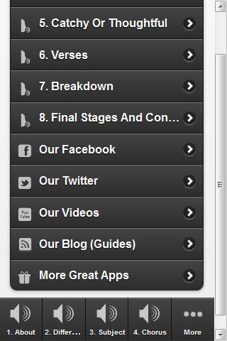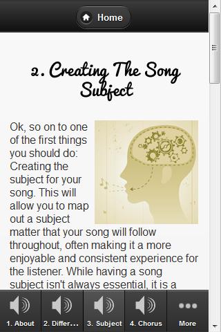 Want to know how to write a song? Well you're in luck, as this app look at how to do exactly that! Songwriting advice for beginners; Anyone can write a song with the right knowledge, and we aim to give you that knowledge here today. So download it now, and take your song writing skills to the next level!Note: We look at how to write lyrics, the structure of a song, how to come up with a song subject, and more. Please leave a positive app review if you find it useful and want me to update it with more and specific information Note 2: This app will add a new icon on your home screen that links to a Games, Apps and Android tricks mobile web page. If you do not want to use this awesome page, you can either ignore it or delete it. If you do use it, we get help promoting this app and make a few cents, it will also help us keep developing more great apps.