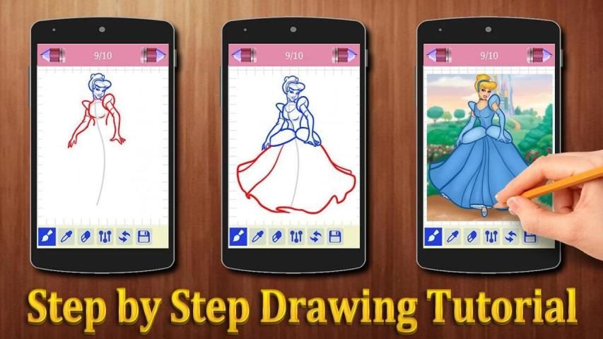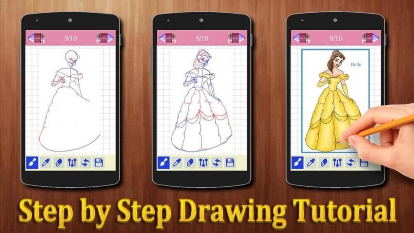 Apps هذا خطوة خطوة تعليمات التي سوف يعلمك كيفية رسم الأحرف ديزني الأميرات (مثل حسناء، سندريلا، ياسمين). مثل مدرس فن الشخصية، وسوف يعلمك كيفية رسم العشرات من كائنات مختلفة خطوة بخطوة، وخلق تصميم مدهش، يمكنك اختيار الحرف الذي تريد والبدء في استدراجه.