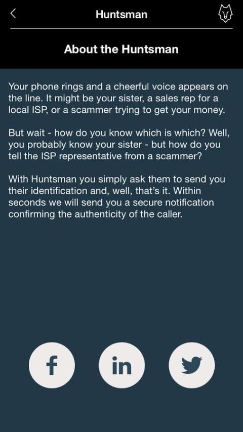 With Huntsman you simply ask them to send you their identification and, well, that’s it. Within seconds we will send you a secure notification confirming the authenticity of the caller.