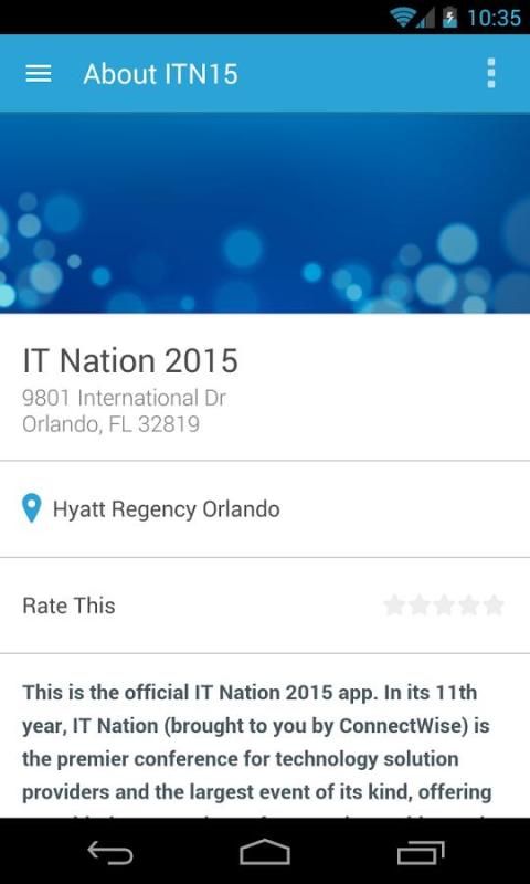 This is the official IT Nation 2015 app. In its 11th year, IT Nation (brought to you by ConnectWise) is the premier conference for technology solution providers and the largest event of its kind, offering a world-class experience for attendees. This app is your key to the 100+ breakout sessions, riveting keynotes, world-class Solutions Pavilion with over 75 vendors, legendary networking events and more! Download the IT Nation app for access to all of the breakout descriptions and speakers, event surveys, venue maps and to stay connected with social media during #ITN15.