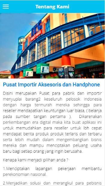 Disini merupakan Pusat para pabrik dan importir menyuplai barang2 keseluruh pelosok Indonesia dengan harga termurah mereka sehingga para reseller mendapatkan keuntungan luar biasa, ( belanja pada sumber tangan pertama ). Dikarenakan perkembangan era digital maka kita buat aplikasi ini untuk memudahkan para reseller untuk lbh cepat mendapat berita produk produk terlaris dan terbaru serta lebih mudah dalam mengembangkan bisnis mereka dan mampu menciptakan peluang usaha baru bagi setiap orang yang ingin berusaha.