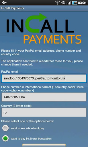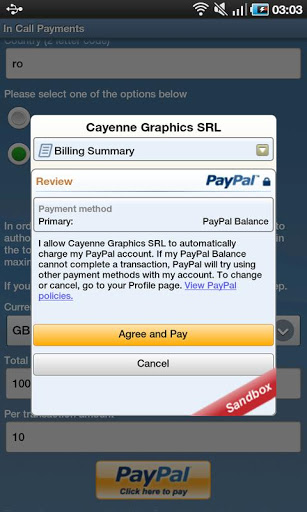 In Call Payments by Cayenne Graphics SRL is an Android application that allows users to send money to or request money from anyone they are talking to on the phone. Both parties must have a valid PayPal account and a compatible phone or tablet running Android 2.0 or newer.The payer only needs to enter the amount and a quick note to the recipient if necessary. The application takes care of identifying the recipient and uses the PayPal Adaptive Payments API to execute the payment on behalf of the payer.When requesting a payment, the requester fills in the requested amount and an explanation for the request. The payer can approve the payment asis or alter the amount before sending.The In Call Payments interface is invoked by a long press on the search key of the Android phone at any time during a call.The payer does not need network connectivity GPRS or wifi when sending a payment, communication is done via cryptographicallysigned text messages. The payee must have network connectivity in order to verify the cryptographic signature of the text message and claim the payment instruct the server to execute the payment and debit the payer39;s account.Users can choose to either pay a 0.50 transaction fee for each payment sent via In Call Payments or view an ad on the quot;Send Paymentquot; page. This setting can be changed at any time in the application configuration page.The application does not require 3G connectivity, it operates over any GSM network. All payment data is exchanged through cryptographicallysigned sms messages
