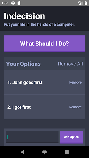 I've made it so easy to use that even a sack of potatoes can work it. You're obviously not as smart as that so here are the instructions. All you have to do is add whatever your options are into the input field followed by pressing add option. Then click the 'what should I do' button and be on your merry little way.