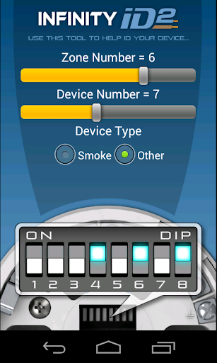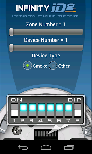 The ID of each device is configured by setting a dip switch contained within all devices. This Infinity ID2 app allows users to easily calculate the dip switch settings by simply specifying the zone and device number. The corresponding switch settings are then graphically displayed so they can easily be copied over to the device.