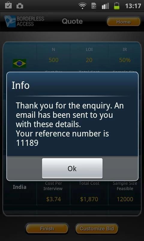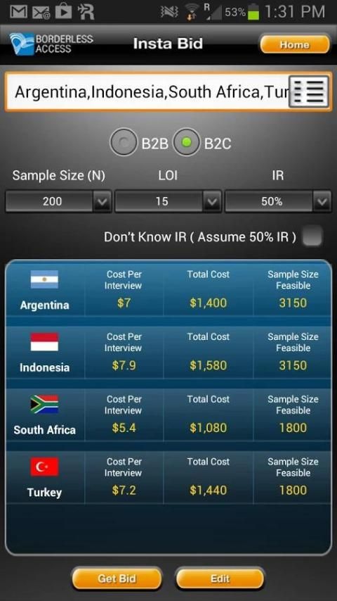 مع InstaBid التطبيق على الهاتف، لم يعد لديك لانتظار إجابة على سؤال العميل الخاص بك - هل هذه الدراسة ممكنة في تركيا؟ في الهند، البرازيل، المكسيك؟ وغيرها الكثير من الأسواق الناشئة.