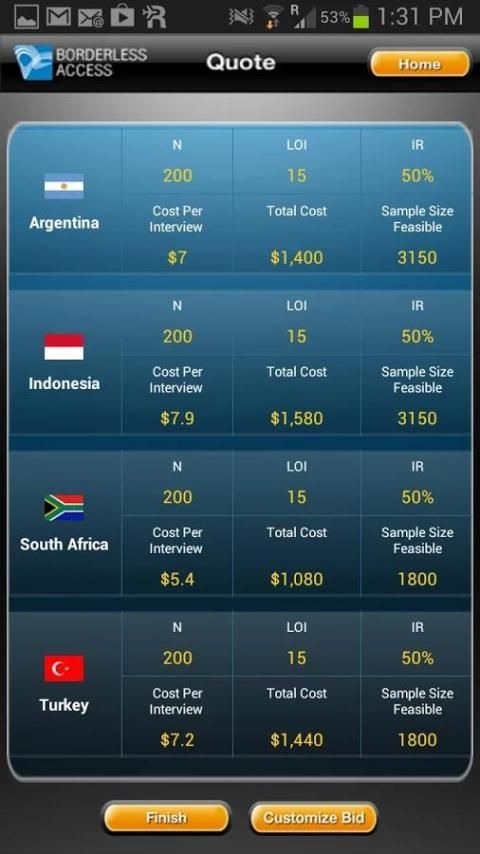 مع InstaBid، يمكنك الحصول على دقة وحداثة المعلومات على أي عينة الدراسة على الانترنت في 10 من أسرع الأسواق المتنامية في العالم، تكلفتها، عينة جدوى، عبر الاستهلاكية واستهداف رجال الأعمال جمهور. وعلاوة على ذلك يمكنك تخصيص طلبك على الطاير من خلال اللعب حولها مع حجم العينة، وطول المقابلة، معدل الإصابة، الشرائح المستهدفة والأسواق لتعطيك السيطرة الكاملة!