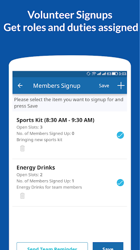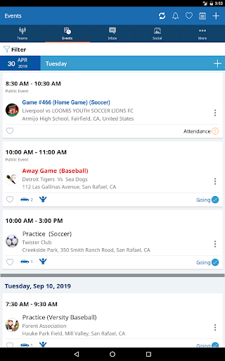 • الحضور وتوافر اللاعب: يمكن لأعضاء الفريق أو أولياء الأمور تحديد توفرهم للأحداث القادمة.يمكن للمدربين تحديد حضور الأعضاء على أنه حاضر أو غائب للأحداث..