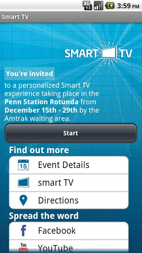 The Intel smart tv app is your ticket to a personalized smart TV experience taking place in New Yorks Penn Station from December 15th 29th. Once the smart TV app is downloaded and complete, you will be identified upon entering Penn Station and delivered your personalized smart TV demo.