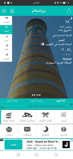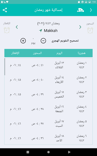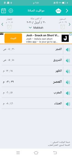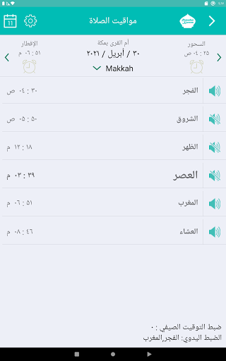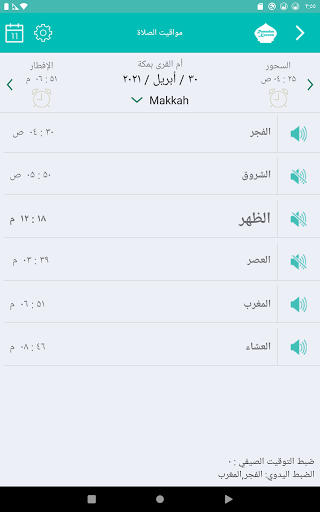 مواقيت الصلاة: محددة بحسب المكان الحالي للمستخدم أو إختيارات الضبط.