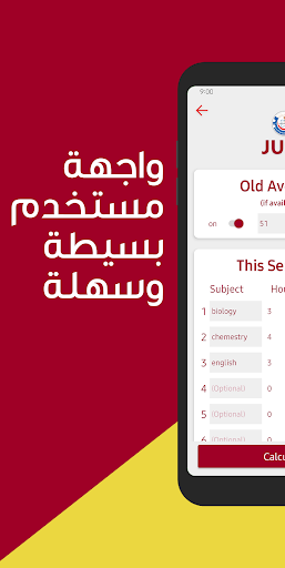 يحتوي التطبيق على واجهة بسيطة للغاية، والذي نرى انه من أهم الأمور التي يبحث عنها الطالب في تطبيق حساب المعدلز