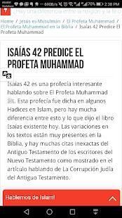 En esta aplicación, voy a hablar sobre el Islam, ¿qué es el Islam? ¿Cómo es el Islam la religión verdadera? ¿Qué hacen los Musulmanes?, luego voy a la sección siguiente acerca del Profeta Muhammad (ﷺ), ¿Quién es él? Cuales son sus enseñanzas y las profecías bíblicas hablando sobre él. Después, hablamos sobre Jesús (Paz sobre él), la creencia Musulmana de él y si dijo que es Dios o no y luego discutiremos el principio de salvación desde el punto de vista del Cristianismo. Después voy a discutir el Corán, ¿Quién lo escribió?, los milagros científicos del Corán y su procedimiento de preservación. Después hablaremos de la Biblia, la creencia Musulmana en la Biblia, y si es la palabra confiable y pura de Dios o no. Finalmente voy a discutir las preguntas principales de los no Musulmanes sobre el Islam.