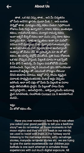 Have you ever wondered, how long it was when you asked your grand parents to tell you a bedtime story? we do remember all those moments in full moon nights and they are still fresh in our minds, we used to travel with them in the fantasy world listening to the maharaja stories, witty ramalinga stories, maryada ramanna stories etc. we are trying to give the same experience to our children."jojo kathalu" is one such attempt to simulate those experiences with out much digital exposure. All you need to do is simply download the app. Every two days a new story will be released, you need to connect your phone to a speaker and let the child listen to it. This will avoid children getting exposed to mobile radiations as there will not be any animation and no further human interaction. The vocabulary in the stories is well explained where ever it is possible, if it is not so, we would request you to explain the same to the kid. We hope you along with your children will enjoy this app and stories.