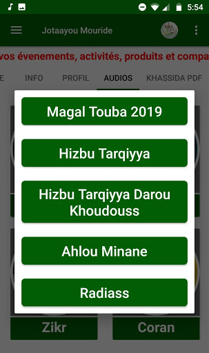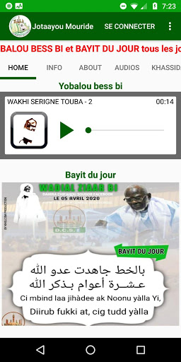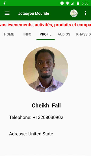 Jotaayou Mouride est une application Android qui vous permet d'écouter des Khassaid, Wolofal, le Coran, gérer les membres de vos dahiras ainsi que la situation financière de chaque dahira dont vous êtes membre. Via l'application Jotaayou Mouride, toute personne inscrite et ajoutée en tant que membre d'un dahira donne par un administrateur (le gestionnaire du dahira), a la possibilité de connaitre la somme de ses différentes cotisations (Adiya, Sass et Sociale) à tout moment et de consulter les dépenses et la somme disponible dans les caisses (Adiya, Sass et Social) de son dahira. L'application offre aussi la possibilité d'envoyer et de recevoir des annonces (vocales ou écrites) entre les membres appartenant au même dahira. D'autant plus, Jotaayou Mouride vous permet de publier vos évènements qui seront visibles pour toute personnes possédant un compte dans l'application. En fin, tous les dahiras auront leur propre répertoire (audio et photo) dans lequel, ils pourront sauvegarder leurs données