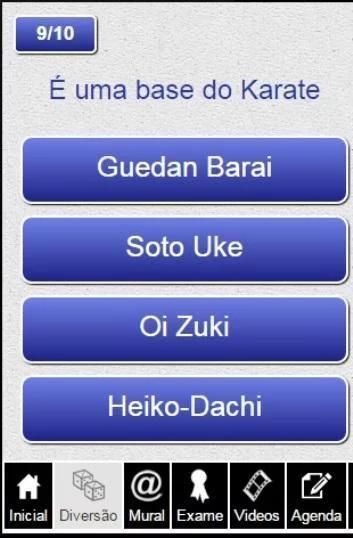 1- DIVERSÃO: Um jogo de perguntas e respostas sobre várias técnicas do Karate, com figuras intuitivas que proporcionam o crescimento intelectual do karateca bem como um excelente passatempo para o dia-a-dia, este jogo está disponível no modo off-line.