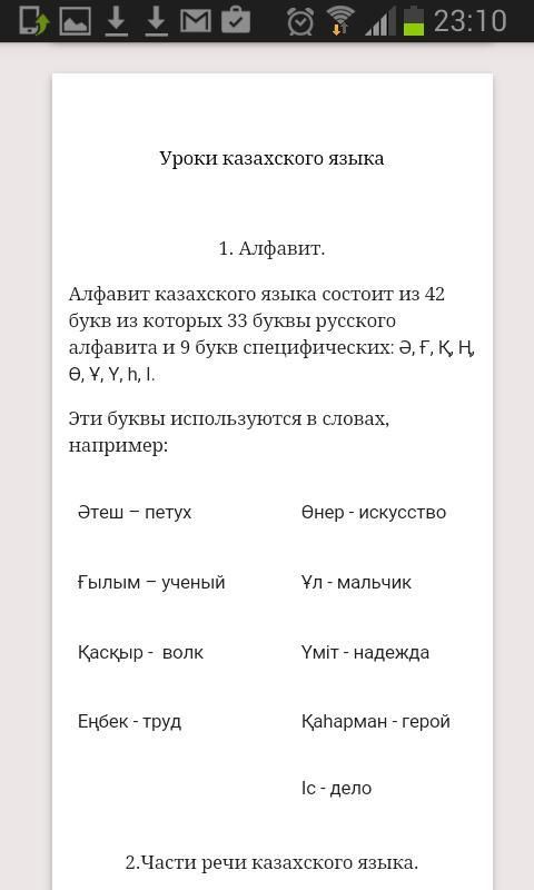 سوف تجد الدروس الكازاخستاني اللغة، كتاب تفسير العبارات الشائعة، وكذلك الأمثال والأقوال. التطبيق على قاموس الكازاخستانية-الروسية متاحة لترجمة الكلمات المطلوبة، فضلا عن نصوص الأغاني الكازاخية. على الانترنت يمكنك ترجمة الكلمات، تعليم الأغاني والأمثال - لممارسة اللغة.