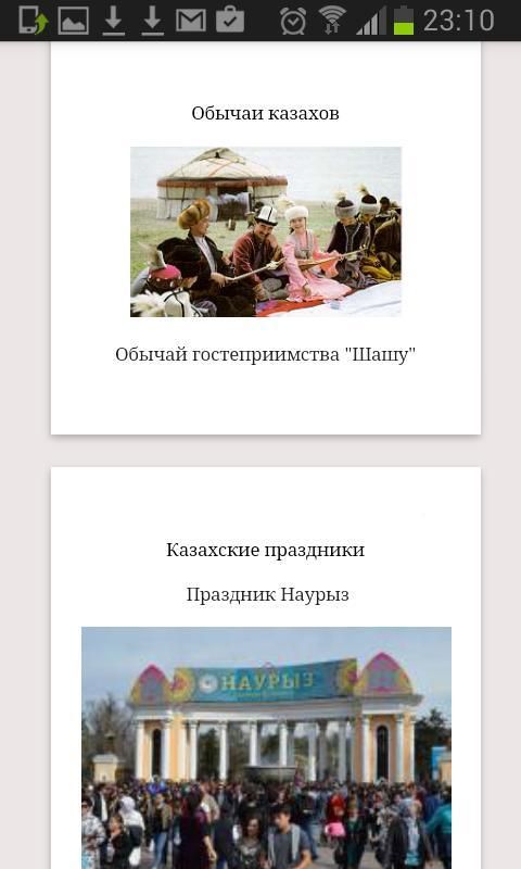 التطبيق يحتوي أيضا على معلومات حول عادات وتقاليد الكازاخ، والعطلات كازاخستان، مطبخ الكازاخستاني وأسماء الكازاخستاني. تحت المطبخ الكازاخستاني سوف تجد وصفات لأطباق الكازاخستانية الأكثر شعبية: الجلد Nauryz وbaursaks.