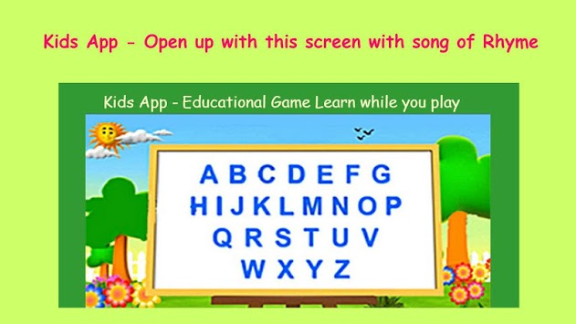 Kids will enjoy as a game mean while kids learn Alphabets A to Z, Numbers 1 - 20, Week days , Months January - December. The App is speak out all the Alphabets, numbers and all the words in a funny voice.