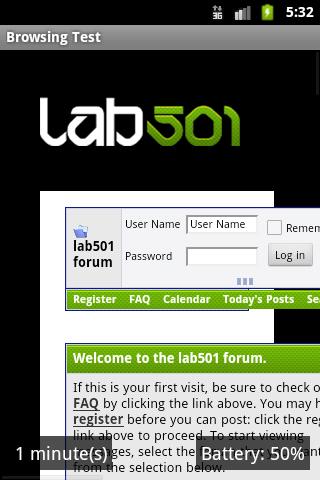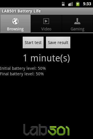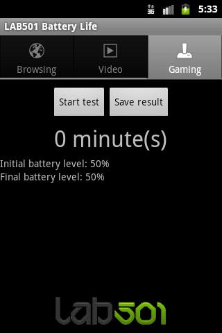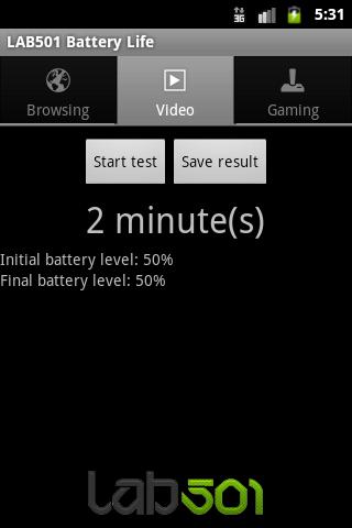 Lab501 Life Battery Life تخزن مستويات البطارية الأولية والنهائية وكذلك المدة لكل تشغيليتم تشغيل الجهاز مرة أخرى بأحدث النتائج.يمكن حفظ النتائج في بطاقة SD كصورة نقطية حتى تتمكن من مشاركتها بسهولة عبر الإنترنت.