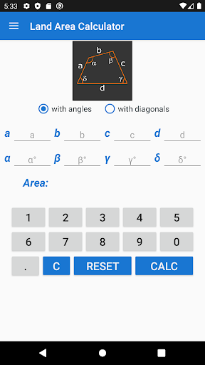 تطبيق مجاني لحساب مساحة الأرض. يجب عليك فقط ضبط قيم الجانبين والأقلان أو الزوايا، واضغط على زر Calcul.سيتم عرض النتيجة على الفور. يمكنك اختيار حساب المنطقة مع الزوايا أو الأقطار. أداة مثالية إذا كنت ترغب في قياس مساحة الأرض.
