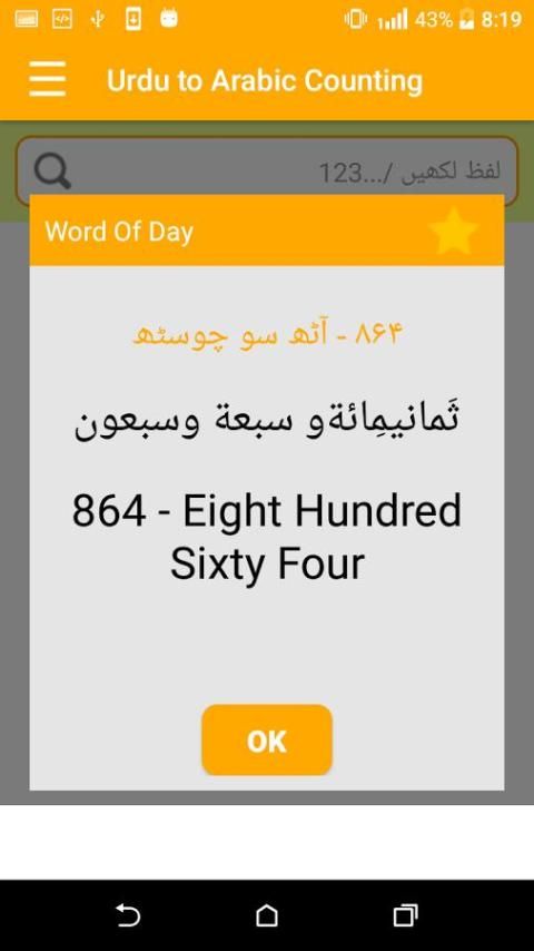 يمكنك البحث من الأردية إلى اللغة العربية واللغة العربية لالأردية من هذا العد تطبيق التعلم دون الإنترنت. هذا التطبيق يشمل 999+ الكلمات العد.