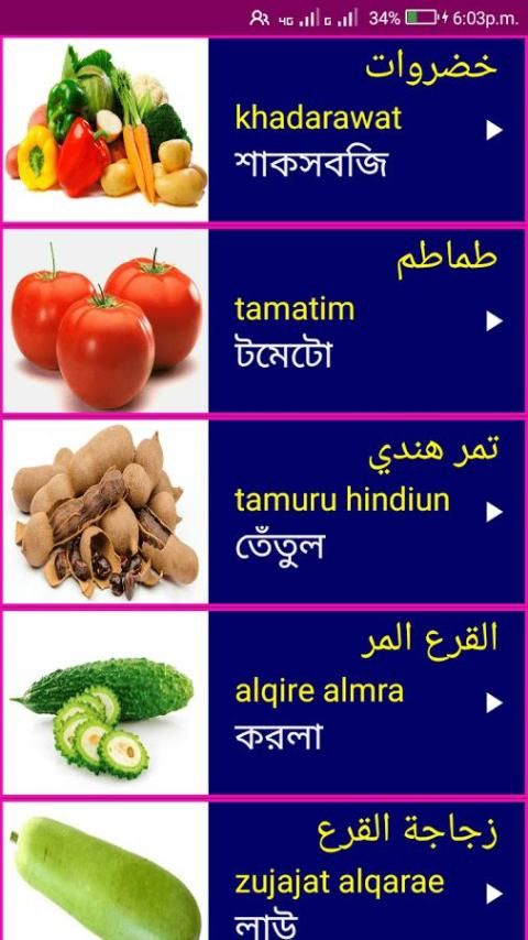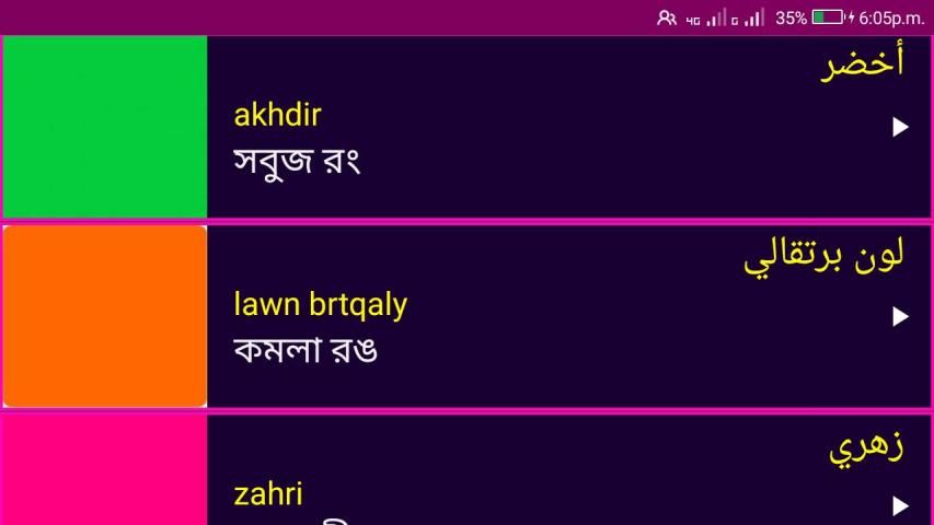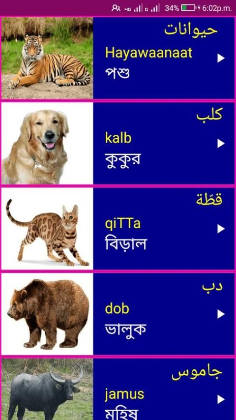 2. وتقدم الكلمات العربية تحت العديد من الفئات المفيدة مثل الحيوانات والطيور والفواكه والخضار، والألوان، والناس، والأرقام، الحروف الهجائية والجمل لتعلم المفردات العربية الهامة من البنغالية بسهولة.