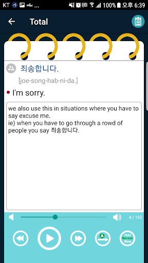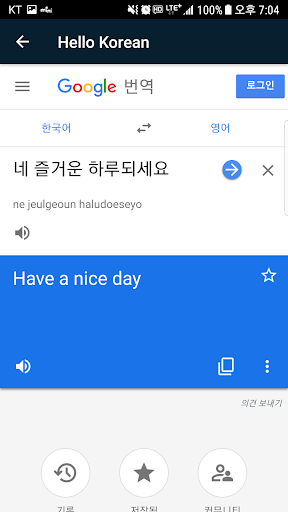 * لنستخدم TTS أندرويد (نص إلى كلام) لقراءة الجمل الكورية والإنجليزية، النطق ليس جيدا مثل السكان الأصليين.