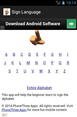 هذا التطبيق سوف تساعدك على تعلم أساسيات للغة الإشارة من خلال المساعدة على تعلم الأبجدية. يمكنك معرفة حرف واحد في وقت واحد أو الأبجدية كلها.