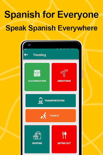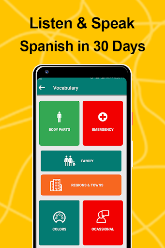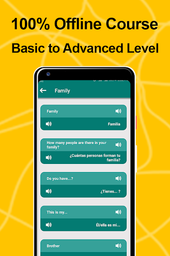 مقسمة إلى 20 فئة مختلفة ، يغطي هذا التطبيق تقريبًا جميع الجوانب الأساسية للغة الإسبانية.هذا التطبيق مجاني تمامًا من التكلفة.جميع الميزات متاحة للمستخدمين مجانًا.من التحيات إلى السفر إلى المواعدة إلى التسوق ، يغطي هذا التطبيق كل شيء.