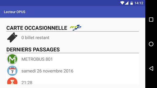 Lecteur OPUS est un lecteur de carte d'autobus portatif. Il indique le(s) laissez-passer(s) courant(s), le nombre de billets restant et affiche l'historique des derniers trajets effectués avec la carte.