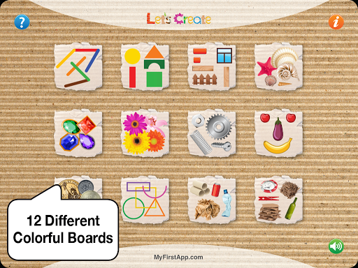 HOW TO PLAY: Each board features assorted shapes and materials that can be used to create a world of images. Drag the elements shown on both sides of the board into the center to create objects, images and scenes.