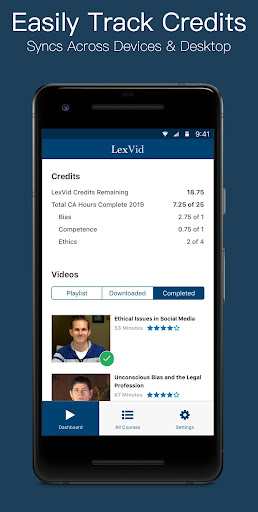يمكن لأي عضو في LEXVID استخدام تطبيق LEXVID لدفق أو تنزيل مقاطع فيديو CLE ، وكسب الائتمان في أي مكان ، في أي وقت في كل ولاية يتم فيها اعتماد دورات Lexvid.قم بتنزيل الدورات التدريبية الخاصة بك في وقت مبكر وكسب CLE أثناء وجوده على متن طائرة أو السفر دون اتصال بالإنترنت.الشهادات هي بريد إلكتروني ، ويتم الإبلاغ عن الاعتمادات تلقائيًا بمجرد عودتك عبر الإنترنت.قم بتنزيل الدورات التدريبية على جهازك للعرض في وضع عدم الاتصال