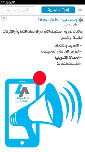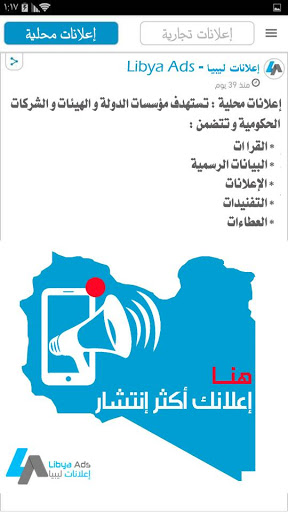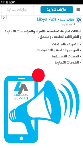 تطبيق " إعـلانات لـيبيـا – Libya Ads " نوفر لك نافذة نحو التميز لدخول أسواق جديدة من خلال توفير منصة لتقديم خدمات إعلانية متميزة سواء للأفراد أو للمؤسسات التجارية أو الهيئات الحكومية.