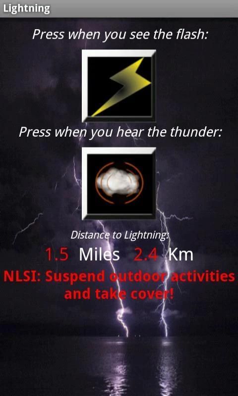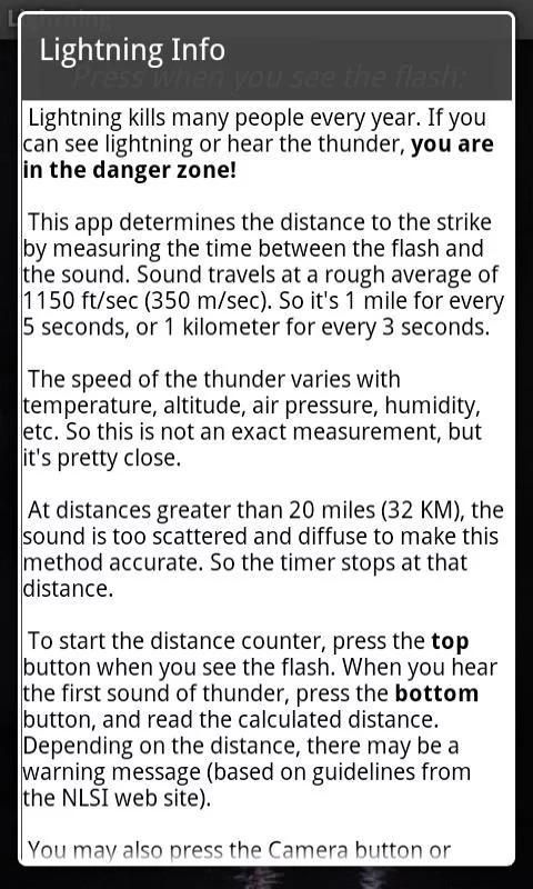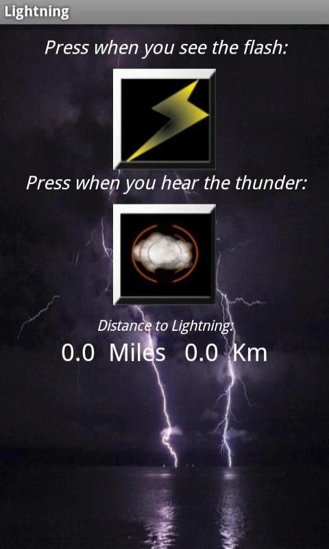 الأصلي الروبوت البرق مسافة حاسبة. اضغط على الزر العلوي عندما ترى فلاش، اضغط أسفل واحد عند سماع الرعد. يتم عرض المسافة في مايلز وكم، وتصل إلى 20 ميل. إذا أردت، يمكنك أيضا بدء تشغيل وإيقاف الموقت مع زر الكاميرا، كرة، أو مد الوسادة.