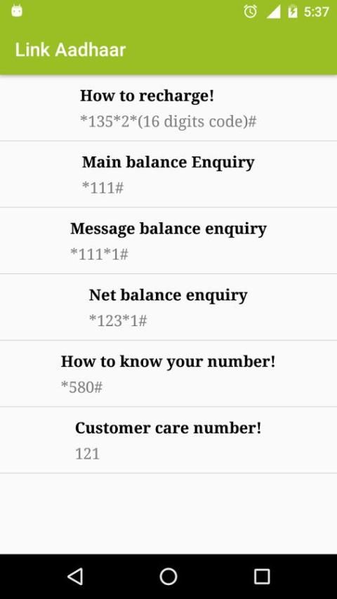 هذا التطبيق يساعد مستخدمي الاتصالات مسبقة الدفع الهندي للعثور على أرقام لعمليات محددة مثل إعادة الشحن، الرئيسي، رسالة، صافي الاستفسار عن الرصيد، العثور عدد وخدمة العملاء الخاصة العدد. اعتبارا من الآن يدعم التطبيق شركات الاتصالات مثل هاتف هوائي، ايرسل، فكرة، وفودافون، Uninor، تاتا دوكومو، BSNL والاعتماد.