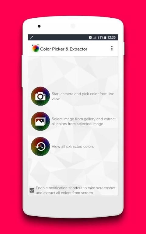 ▶ Just client on the notification shortcut and it will take screenshot of your current screen and extract all the color codes from the screenshot.