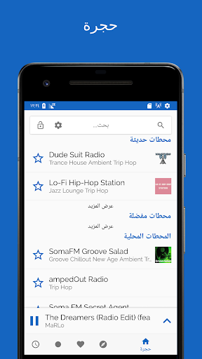 يمكنك وقف و استئناف البث بالراديو الخاص بك. إذا أرسلت المحطة معلومات حول الأغاني المشغلة، فكل الأغاني التي يتم الاستماع إليها تعرض و يمكن حفظها بنقرة واحدة.