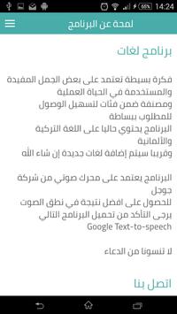 برنامج لغات فكرة بسيطة تعتمد على بعض الجمل المفيدة والمستخدمة في الحياة العملية ومصنفة ضمن فئات لتسهيل الوصول للمطلوب ببساطة البرنامج يحتوي حاليا على اللغة التركية والألمانية وقريبا سيتم إضافة لغات جديدة إن شاء الله