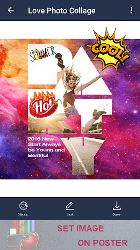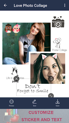 Love Photo Collages تشمل صور ملصق صور ملصق و 8 صور ملصقة في شبكات أوضاع مع 50 ملصقات الصور الحبوحب حدود الصور تحت عنوان.يمكنك الكتابة على الصور وإضافة نص إلى الصور والمعلامات في نقل الرسائل.