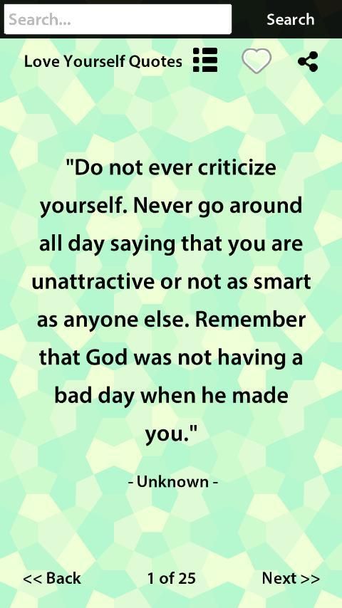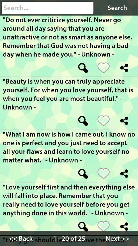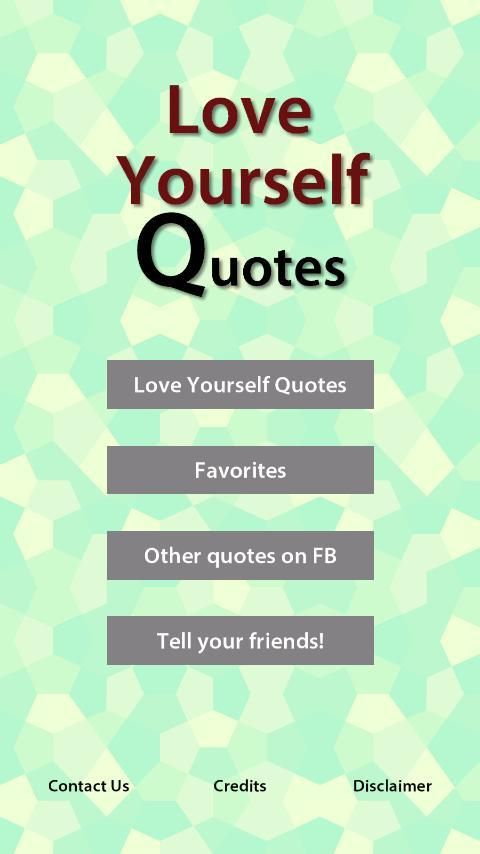 هذا هو مجموعة من الحب نفسك اقتباسات. كل شخص لديه الوقت حزينة. في وقت ما نشكو وننظر إلى أسفل أنفسنا عندما نفعل شيئا خاطئا. هذا شيء طبيعي. كل يمكن أن تجعل من الخطأ. الشيء أهمية هو أنه يجب ألا ندع هذا الشعور يكبر. يجب أن يكون لديك الثقة في نفسك. يجب أن تحب نفسك وتكون على ثقة في قدرتكم. لديك القدرة على النجاح في حياتك. لا تدع سيطرة الشعور السلبي لك. هذا هو التطبيق الذي سوف نقدم لكم مقتطفات من شأنها أن تجلب لك التشجيع والمشورة. و لا تنسى، تحب نفسك قبل الآخرين.