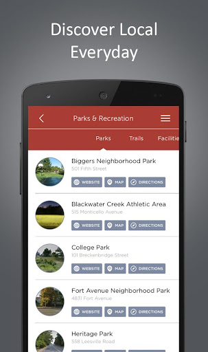الحكومة والحدائق & amp ؛تتيح لك أقسام الترفيه الحصول على جميع معلومات الاتصال والوجهة المهمة في مدينتك بنقرة زر واحدة.تعرف على تاريخ مدينتك ، والموظفين التركياريين والمسؤولين المنتخبين.ابحث عن الحدائق والمرافق ونقاط المصالح جنبًا إلى جنب مع المعلومات وأرقام الهواتف والخرائط والاتجاهات.هاتفك.يتم تتبع المشكلات من التقرير الأولي إلى القرار في & quot ؛ تقارري & quot ؛القسم وستتلقى إشعارات الدفع مع تقدم تقريرك.تطبيق #39 ؛ وابدأ في التعامل مع مدينتك على مستوى أكثر جدوى.كن مواطنًا مدنيًا اليوم!